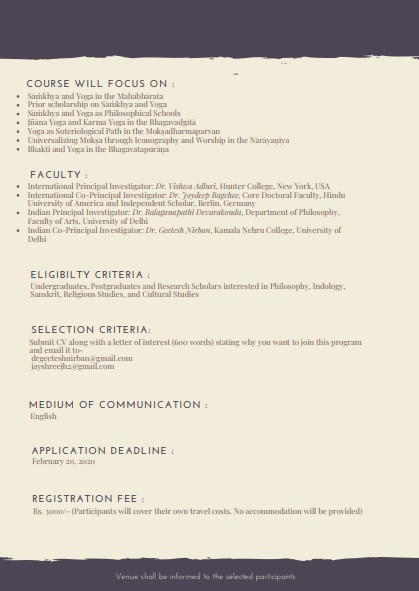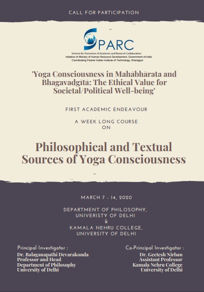 Indic Academy is pleased to announce a grant of Rs. 10,000 or actuals, for upto five students towards the registration and travel for the upcoming course titled ‘Yoga Consciousness in Mahābhārata and Bhagavadgītā: The Ethical Value for Societal/Political Well-being‘. This is a week-long course between 7th and 14th March, 2020, on Philosophical and Textual Sources of Yoga Consciousness . For students in Delhi, Indic Academy will provide a registration grant of Rs. 3000/-.