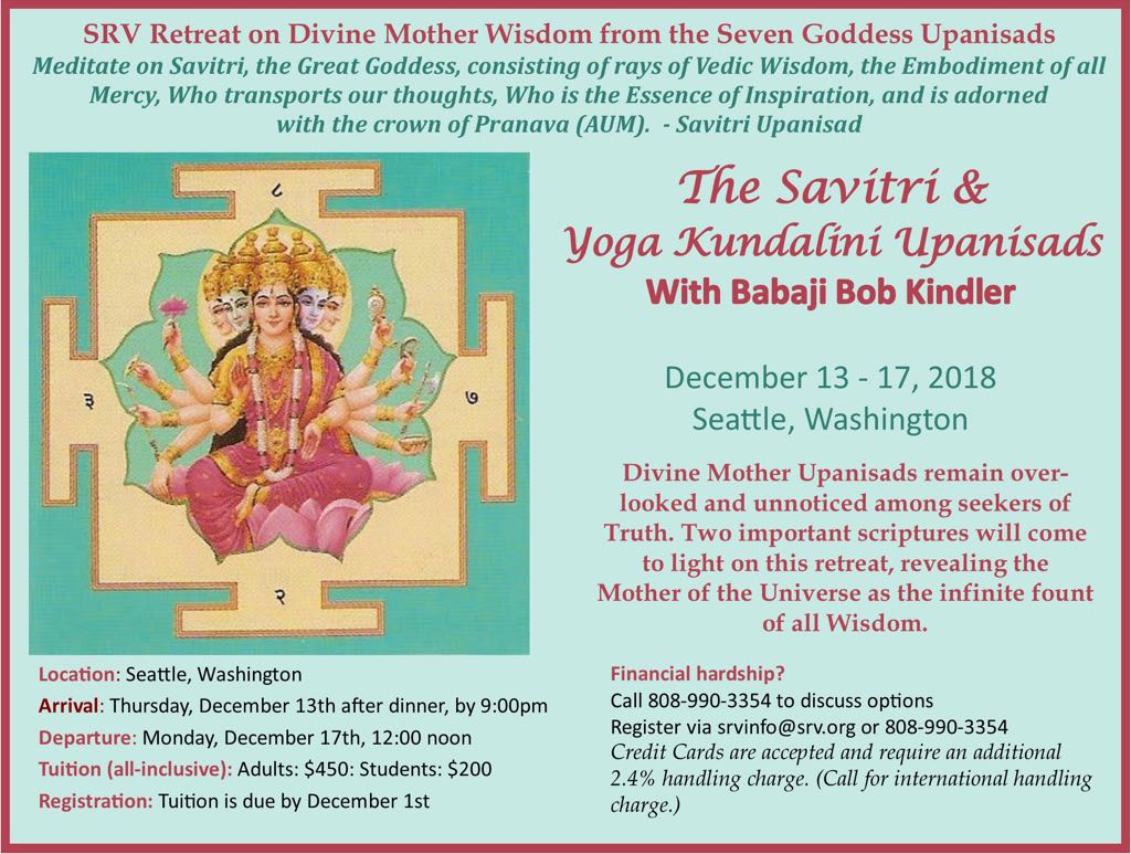 Among the Upanishads, the Devi Upanishads remain unnoticed and overlooked among seekers of Truth. Two important scriptures, the Savitri Upanishad and the Yoga Kundali Upanishad will come to light in this retreat, revealing the Mother of the Universe as the infinite fount of all Wisdom.