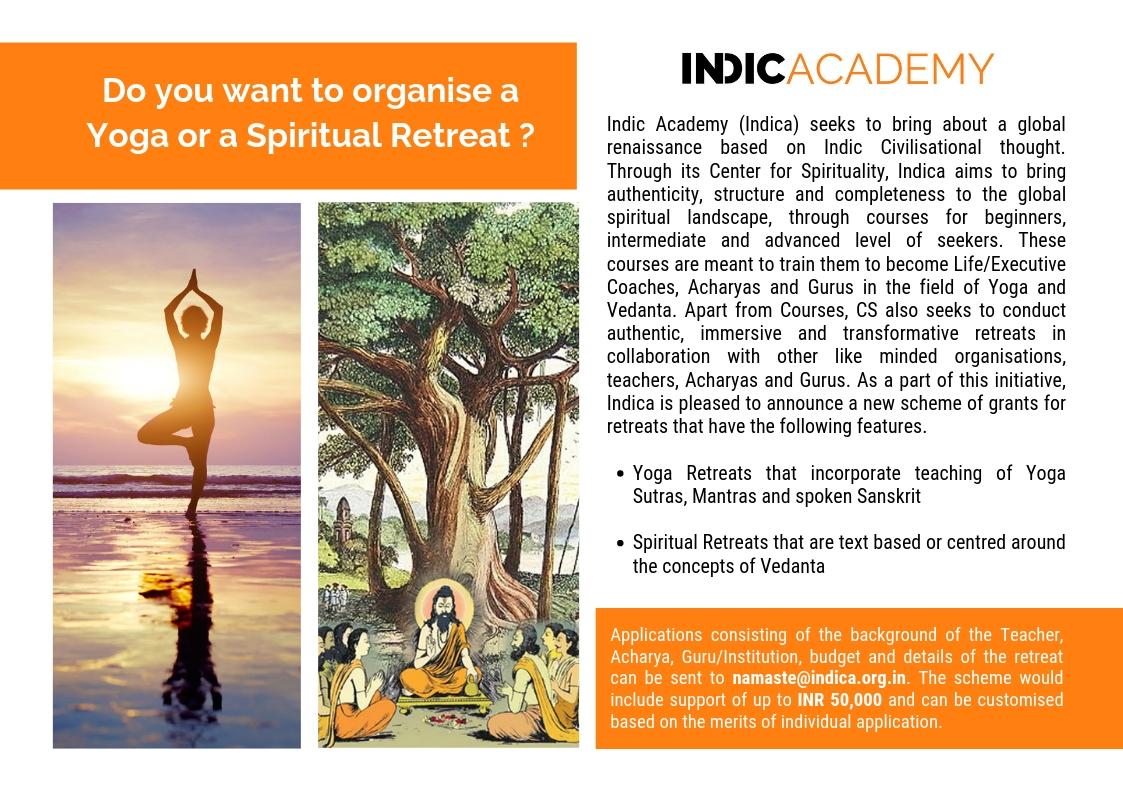 Applications consisting of the background of the teacher, Acharyas, Gurus or institutions, budget and other details regarding the retreat can be sent to namaste@indica.org.in. The scheme would include support of upto INR. 50,000 and can be customized based on the merits of the individual application.